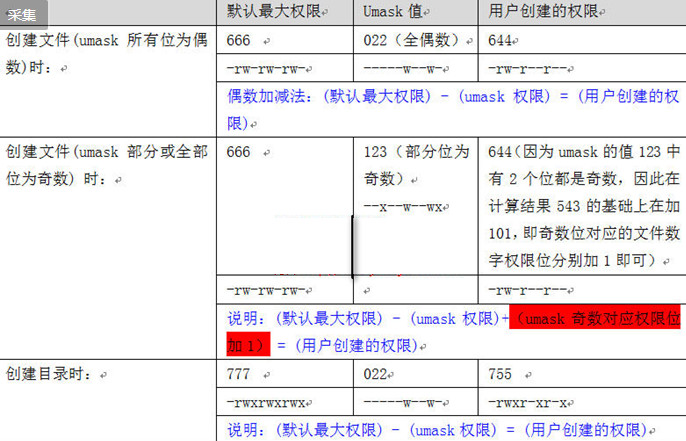 文件的默认权限 为 666, 创建目录的默认权限 777, 而umask值则表明了需要从默认权限中去掉哪些权限来成为最终的默认权限值, 文件默认不能具有执行权限,如果算的结果中右执行权限,则将其权限加1;