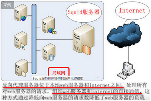 反向代理:让多节点主机反向缓存网站数据 服务器机房(多节点主机->Squid服务器->Internet->公网用户)