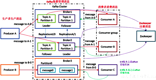 Broker:一台kafka服务器就是一个broker;一个集群由多个broker组成。一个broker可以容纳多个topic;Topic:可以理解为一个队列;Partition:为了实现扩展性,数据量大的topic可以分布到多个broker(即服务器)上,一个topic可以分为多个partition,每个partition是一个有序的队列。partition中的每条消息都会被分配一个有序的id(offset)。kafka只保证按一个partition中的顺序将消息发给consumer,不保证一个topic的整体(多个partition间)的顺序;Offset:kafka的存储文件都是按照offset.kafka来命名,用offset做名字的好处是方便查找。例如你想找位于2049的位置,只要找到2048.kafka的文件即可。当然the first offset就是00000000000.kafka;- Zookeeper:存储Kafka集群信息,实现集群的高可用;